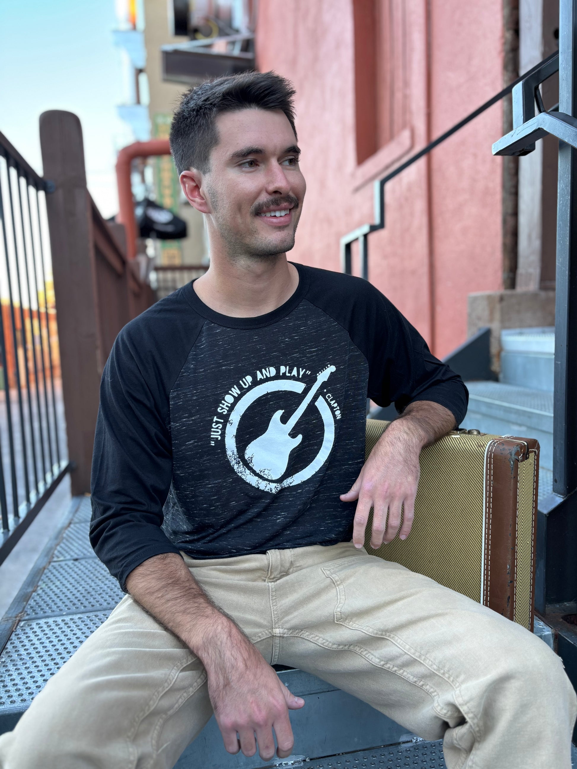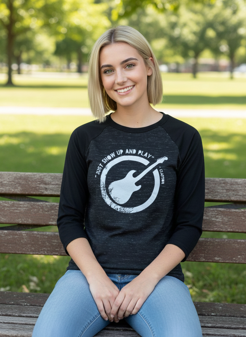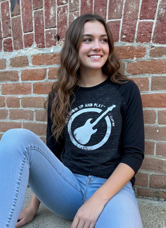 This fun and comfortable, unisex, lightweight baseball jersey calls out to musicians and Eric Clapton fans. This is a two tone design with charcoal marble color and Eric’s quote “Just show up and play”. Bella and Canvas, poly-cotton.